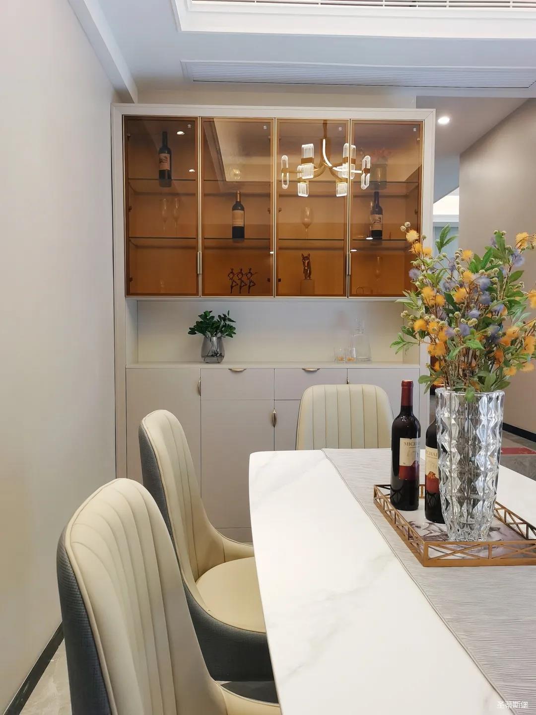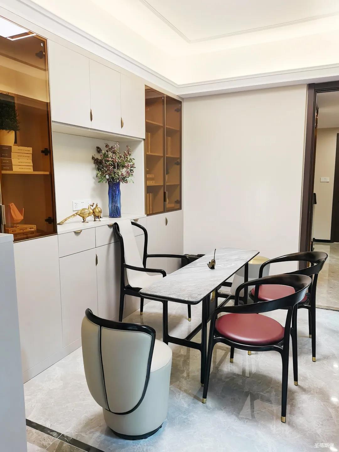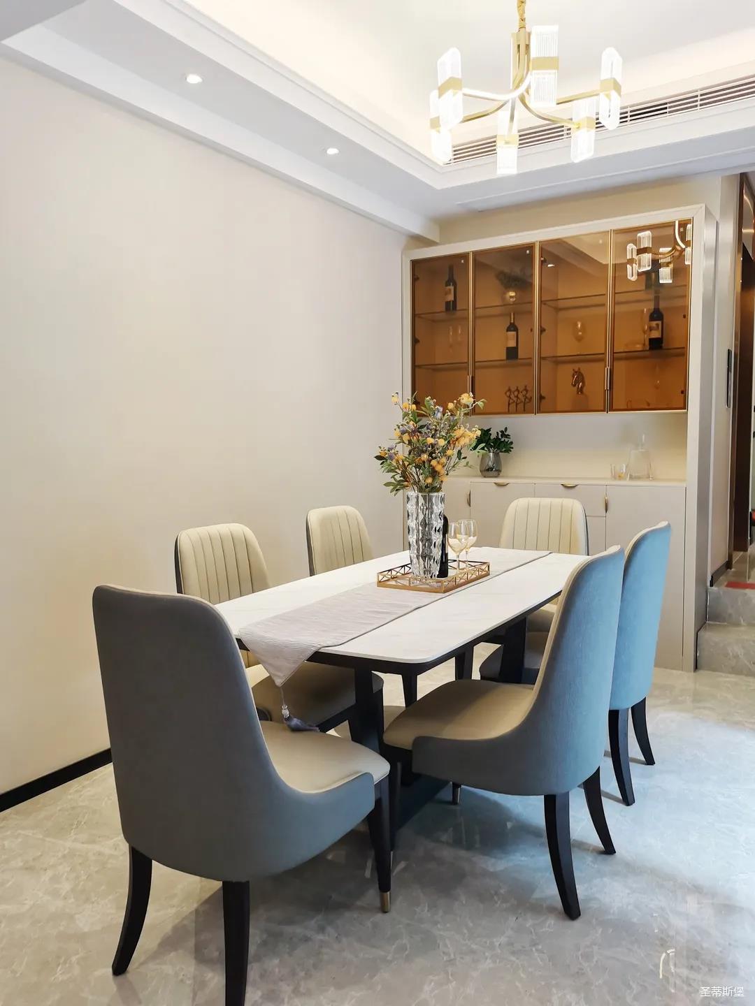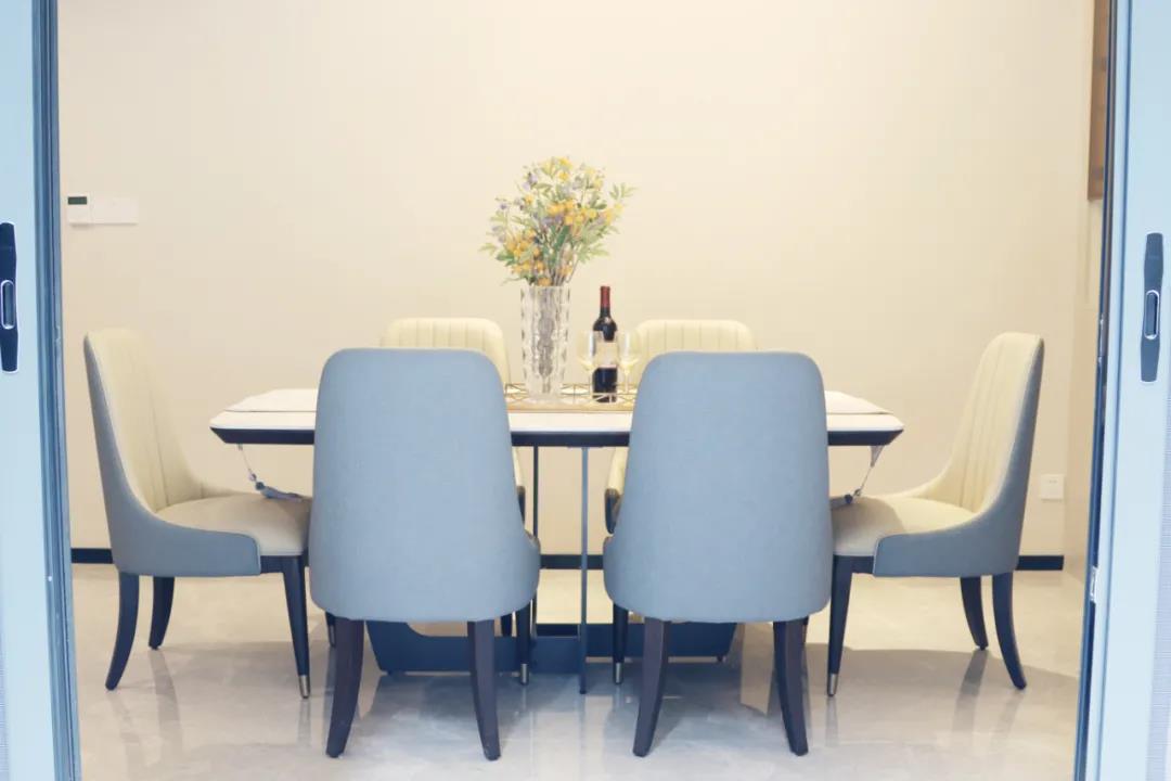 客餐厅虽属同层,但由廊道隔开,各有宽阔的空间格局,加上引入自然光源的采光设计,空间通透明亮。岩板餐桌搭配的真皮餐椅,让不同的材质在在空间完美契合,既增加了空间的时尚氛围,也能给人良好的用餐体验。