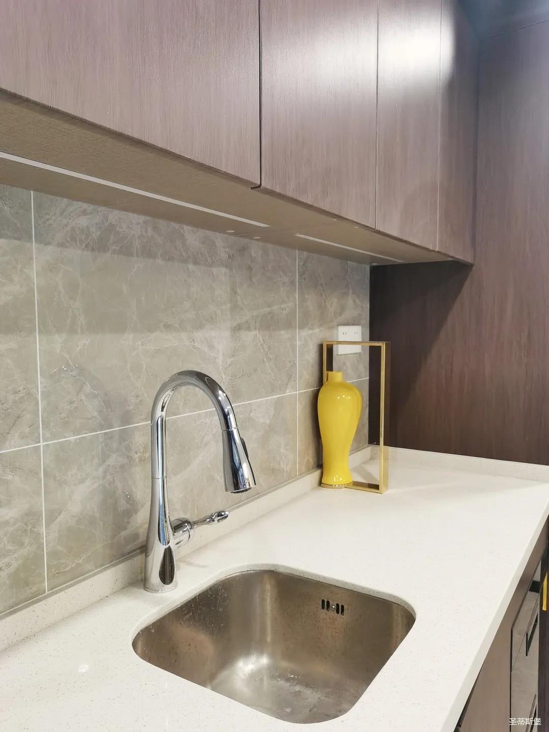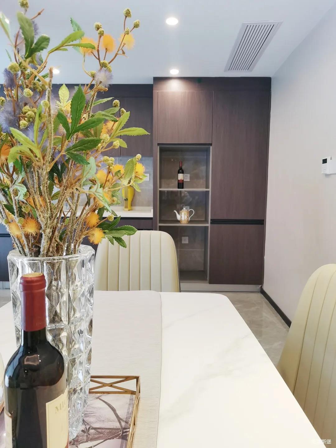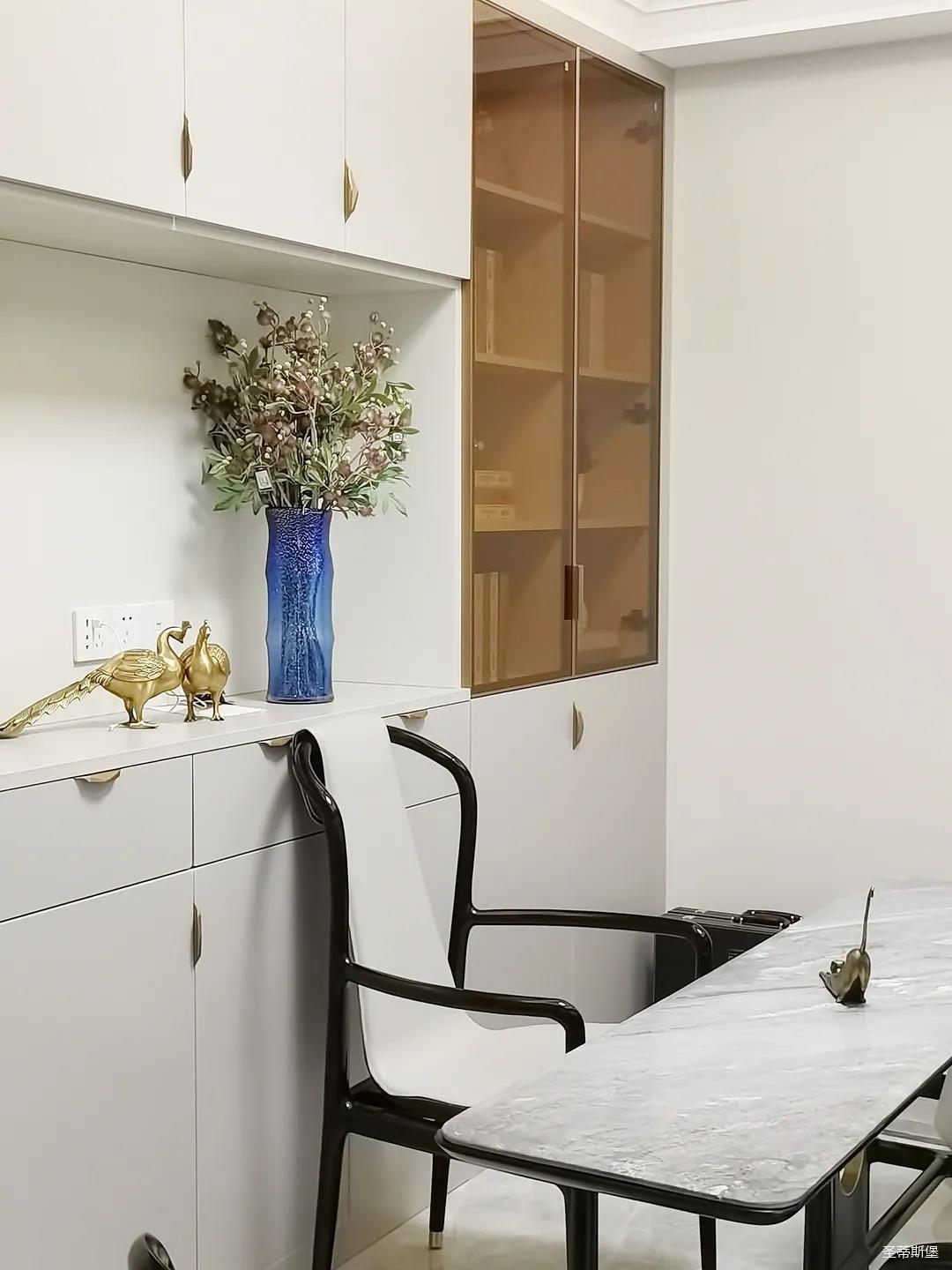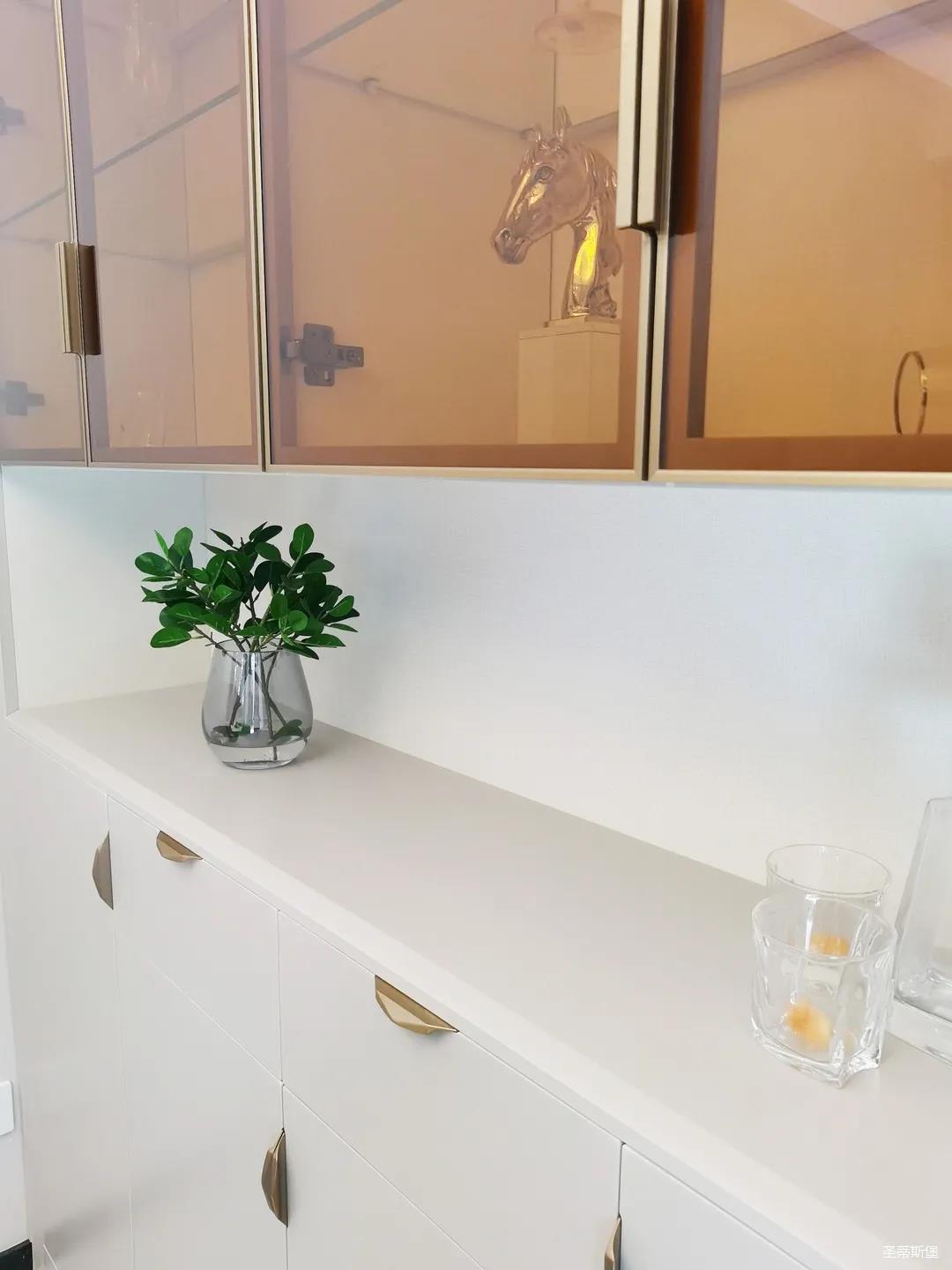 开放式的餐厨设计让餐边柜和橱柜的居家动线更为流畅,成了最便利的收纳场所,生活小资而又美好。