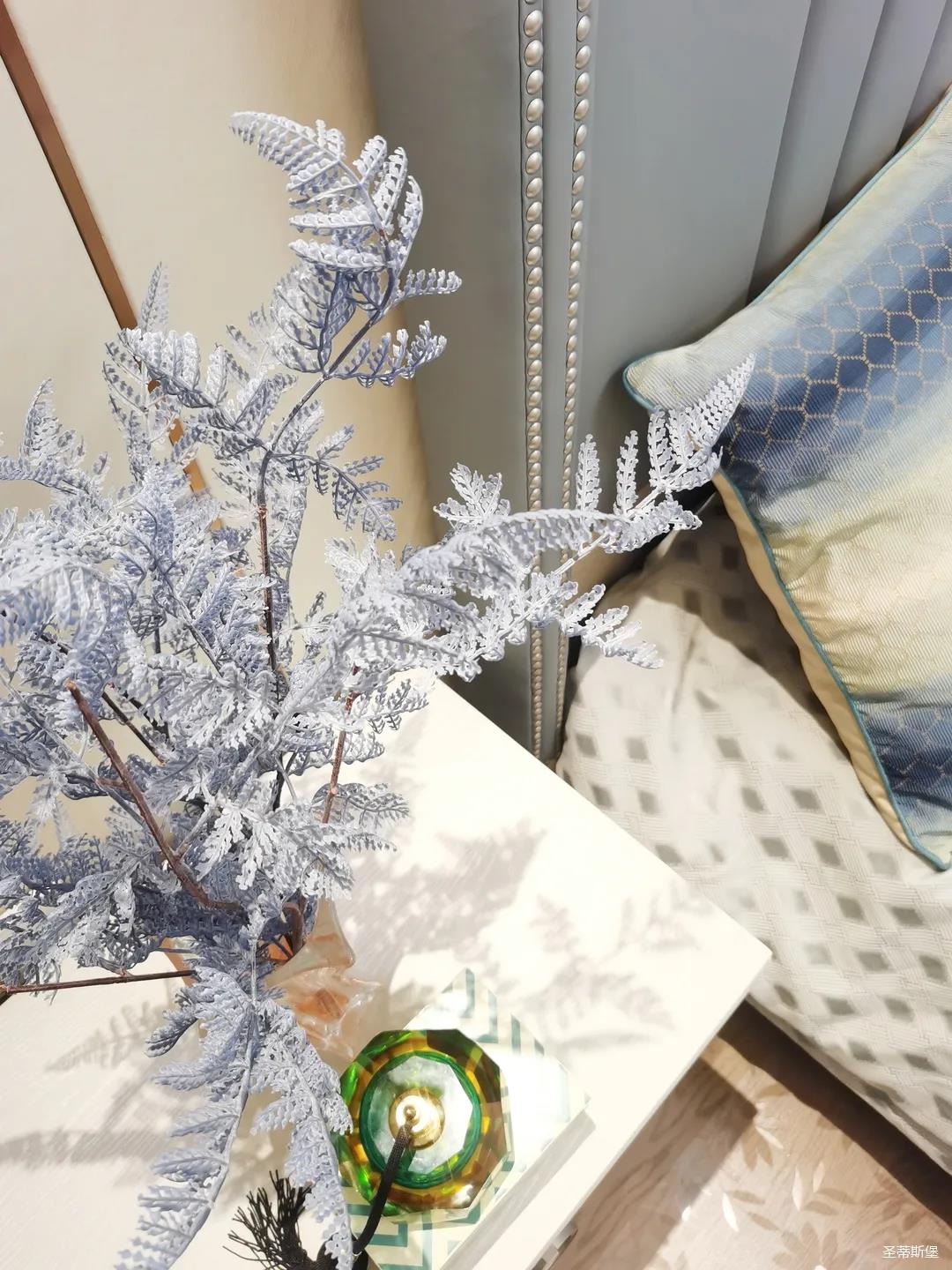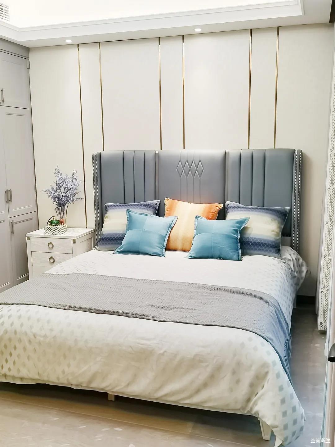 一楼的房间业主是作为长辈房,采用轻奢的背景墙面,结合亮眼的金属线条设计,空间显得时尚又不失沉稳。莫兰迪色的浅蓝床屏,在无主灯设计与自然光线的碰撞下酝酿出不同的光影美感。