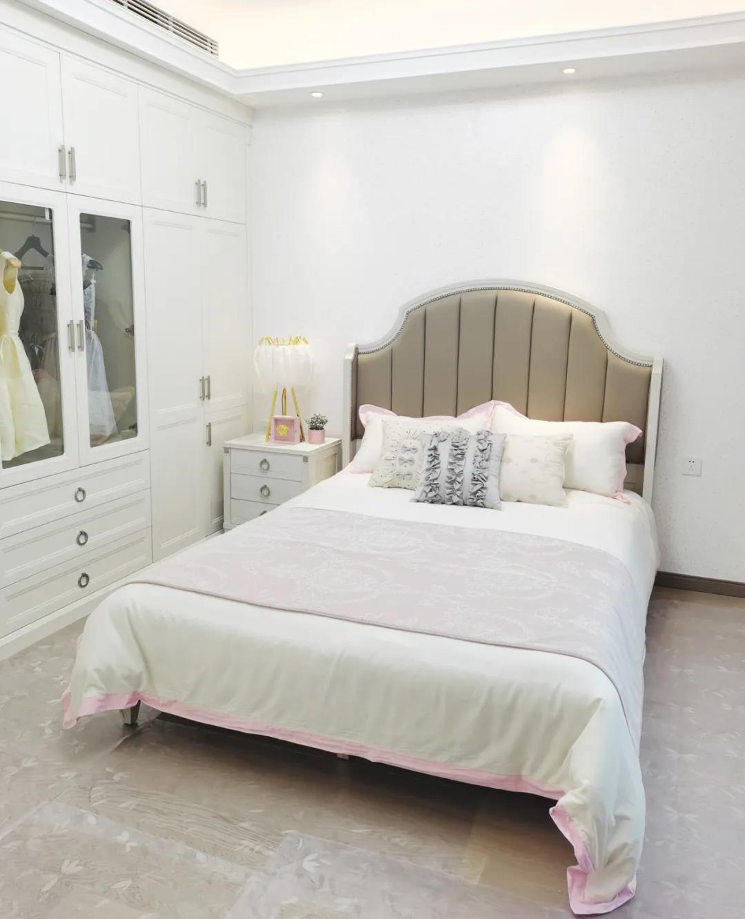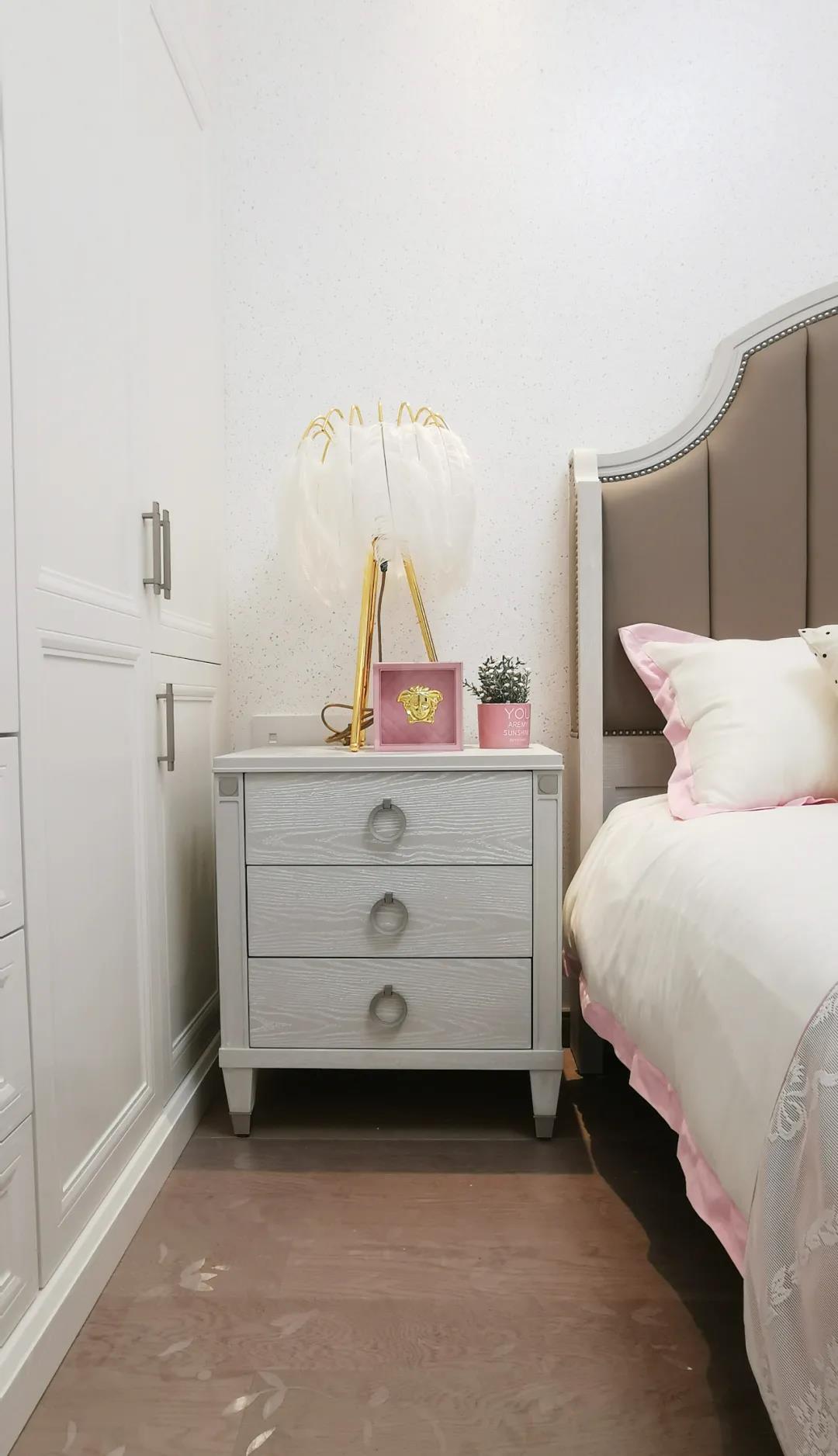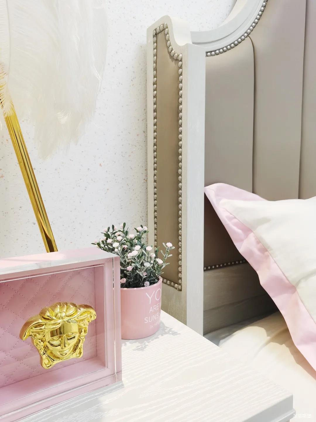 少女粉软包床屏搭配仙气十足的羽翼台灯,让空间显得尤为梦幻。功能与颜值兼具的定制衣柜,与温柔的空间相得益彰,简单优雅的同时也不失童趣。