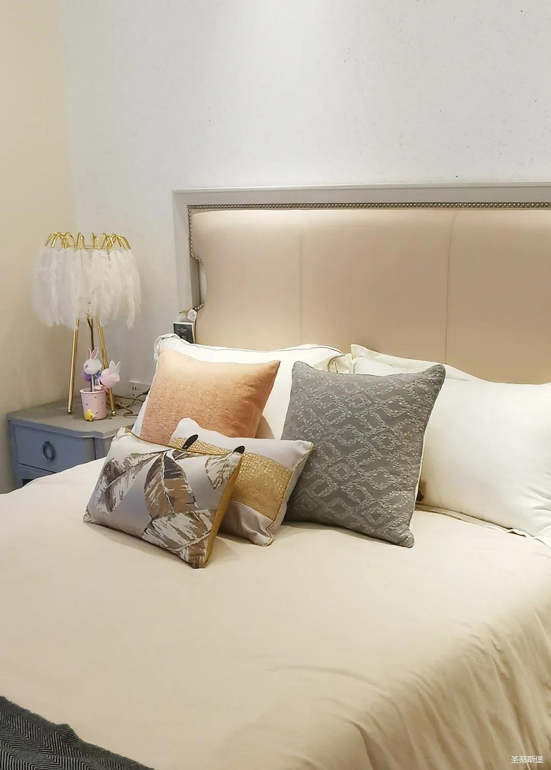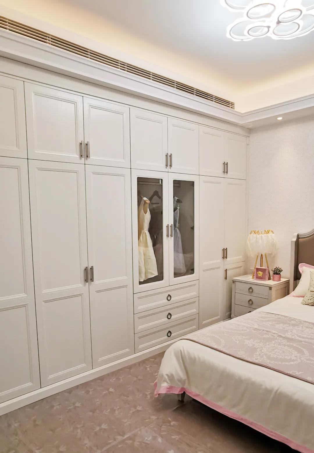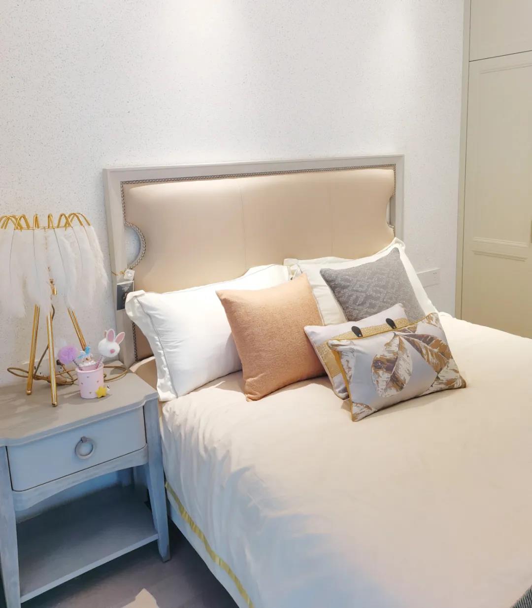 少女粉软包床屏搭配仙气十足的羽翼台灯,让空间显得尤为梦幻。功能与颜值兼具的定制衣柜,与温柔的空间相得益彰,简单优雅的同时也不失童趣。
