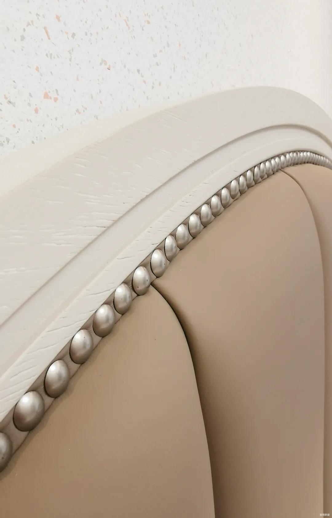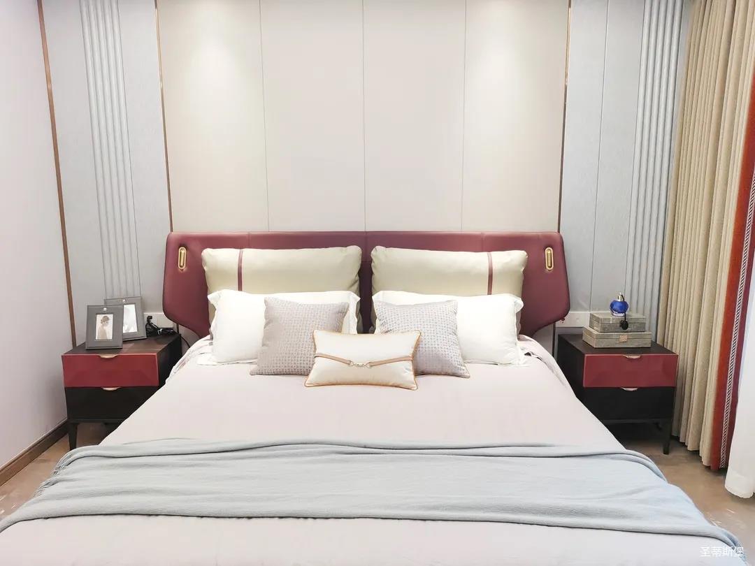 三楼的主人房设计风格更偏向简约,浪漫的酒红色床屏运用了曲面造型,融合了极简主义美学和轻奢元素,小型夜间感应灯设计让每一处细节都充满着时尚优雅的气息。夜间倚靠在厚实的软包上,时光好像在不知不觉中慢了下来,让我们能品味和咀嚼生活的氛围。
