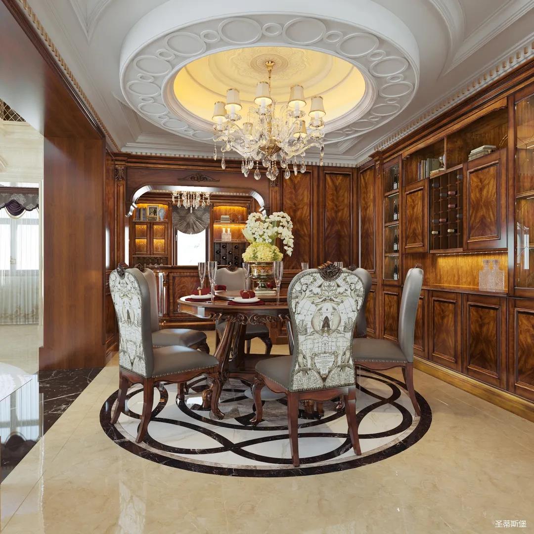优雅有质感的纯正美式风格居室,灯饰是必不可少的配饰,设计师通过光线对空间进行解读,让复古韵味十足的金属挤进这日常繁华与琐碎的间隙中,剔除空间内繁冗的杂质,独留纯净,从容淡然。美式的宫廷地毯,以一抹亮色展现,在精巧的水晶吊灯渲染下,更是平添几分古朴韵味。