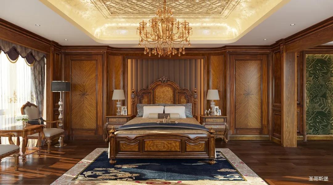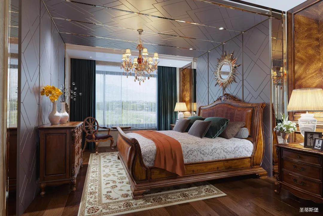 主卧整体设计是美式与现代的完美整合,既保留了纯正美式的形和实木雕刻艺术,又具有浓重的美式配色,浓浓的艺术气息不自觉在浪漫的美式空间流淌。流畅的弧线花饰以及丰富的木作线条别具匠心。大气稳重与舒适雅致并重,并借由开放的布局、灵活的动线,共同促成了整个空间极具复古浪漫的情调。