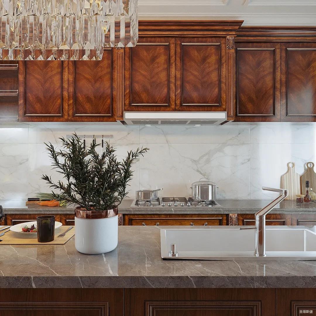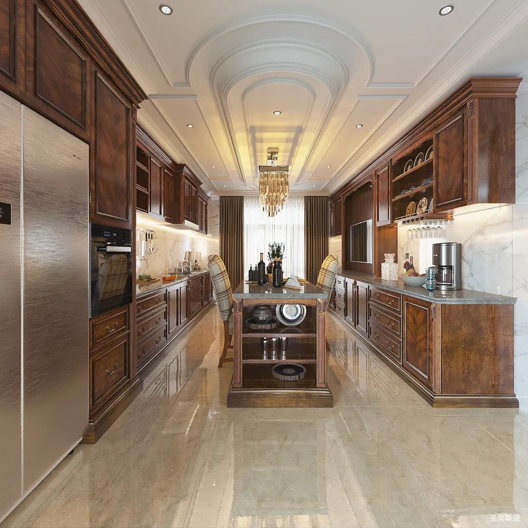 西厨设计更为统一,女业主喜好柔美优雅的视觉效果,因此设计师特意将吊顶转角做了圆弧处理,使冷峻的空间略带圆润,形成精致协调的空间格局。简洁的石膏吊顶与吧台一致延伸,让厨房视觉空间得以扩大。金属元素水晶吊灯,增加了空间的精致感,美式定制柜体将古典元素与现代电器相糅合,交错产生一种自然的违和感。